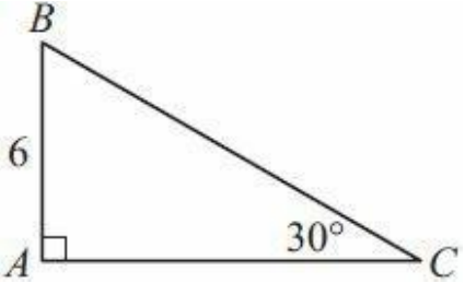 解析:30,60,90度內角三角形變長特殊比例為1√32,因此對應AB和AC長度分別為6和6√3,三角形面積為18√3,選D。