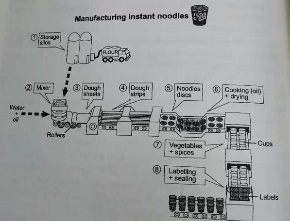From here, the dried noodles are placed in cups and both vegetables and spices are added. It is not clear whether these are packaged separately or simply placed on the top of the noodles.The final stage is that of labelling and sealing. The final product is placed on a conveyor belt and presumably sent for final packaging, although this is not explicitly shown.