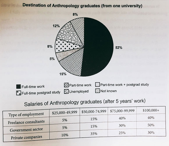 The chart below shows what Anthropology graduates from one university did after finishing their undergraduate degree course. The table shows the salaries of the anthropologists in work after five years.