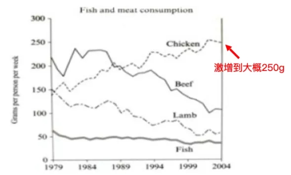 譯:到2004年,它(雞肉的消耗量)已經激增到了大概250g每人每周。