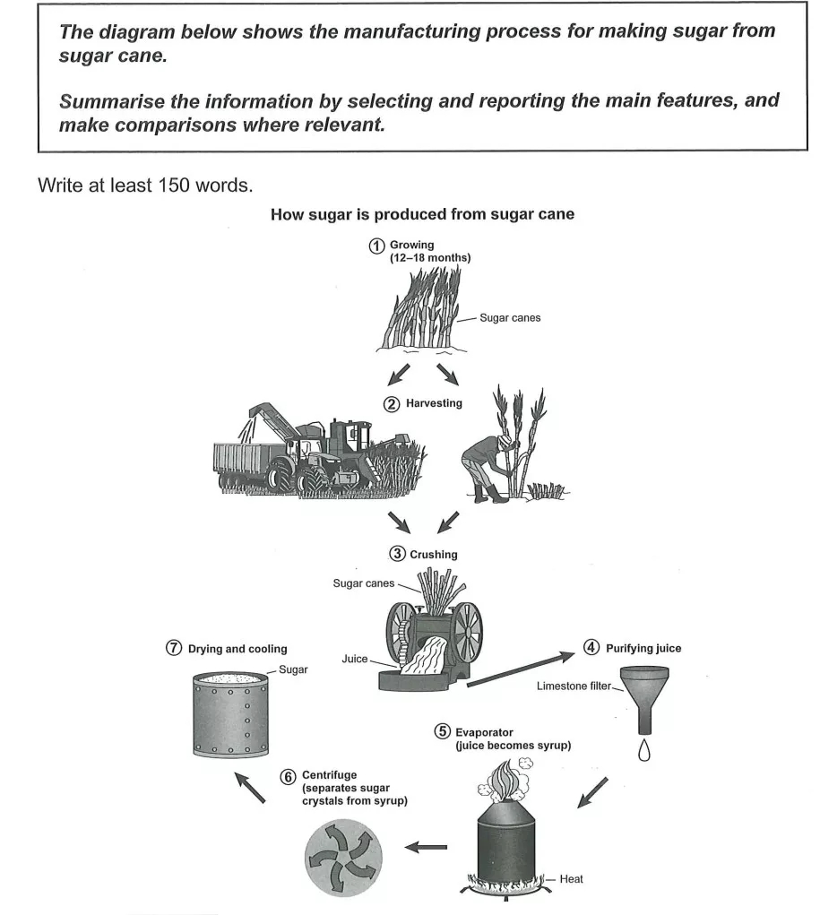 To produce cane sugar, one raw material – <同位語的插入現象> ripe sugar canes – is the necessity. <先后順序可以利用時態來體現> Having matured for one year to a year and a half, the canes are reaped <注意兩個箭頭,可使用平行結構> either by a giant harvester or by farmers with sickles. <表語從句> The subsequent step is that the <頂針:前一個的動詞可以轉成同根詞不同詞性變體,加強步驟間銜接緊湊> harvested canes are squeezed into juice by a rolling crusher. Till now, all the preparatory procedures are accomplished.