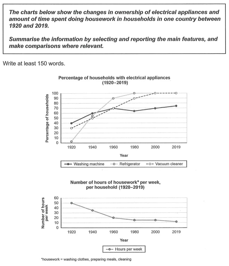 The lines illustrate the changing percentages of the electronic appliances ownership and the weekly time allocated to housework, including washing clothes, preparing meals and cleaning, from 1920 to 2019. Overall, with the proliferation of versatile electrical appliances, people had been living a more convenient life with higher efficiency, which can be mirrored by the ever-decreasing hours spent in addressing domestic trivialities.