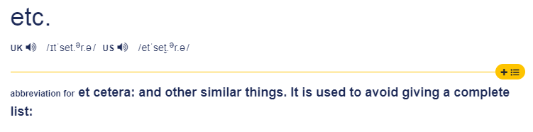 etc用于列表末尾,表示只提到了部分相關的內容,但沒有給出完整的列表。翻譯成中文可以理解為“等;諸如此類,以及其他”等含義。