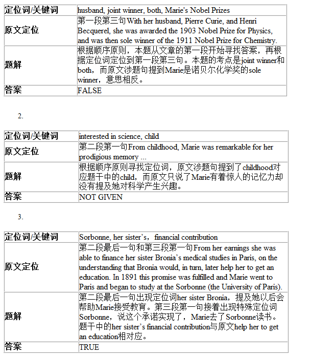 解析:判斷題一般都是按照正序出題,確定了第一個題目在原文中的定位,便可根據順序原則依次尋找其他題自的答案。做判斷題時注意找出定位詞,定位可以幫助考生迅速在原文中找到出題位置,考點詞用于確定題干的判斷點。