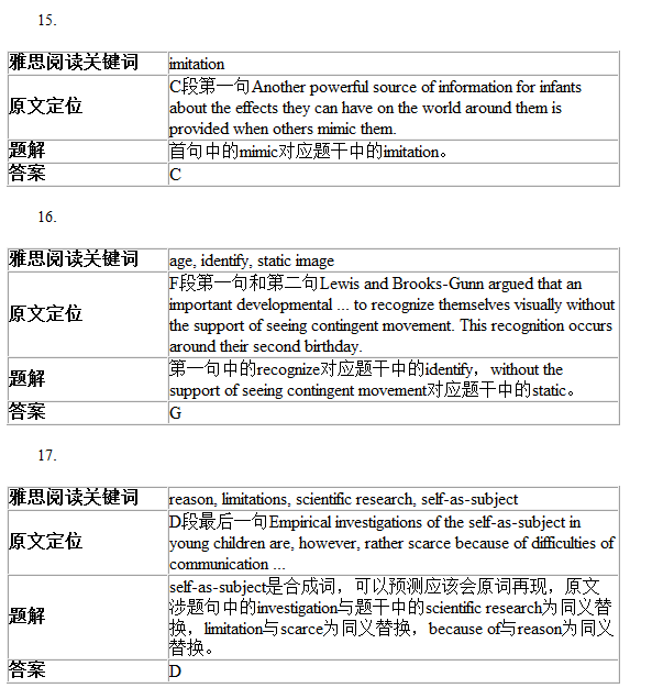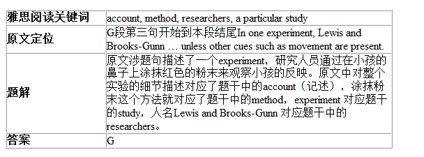 解析:本題型為段落信息配對題,命題的兩大特點為:徹底同義替換和絕對亂序。所以,應(yīng)從理解段落入手,而不是按照題目順序來尋找答案。同時,留意題目要求中是否有NB信息,這意味著是否有段落會被復(fù)選。