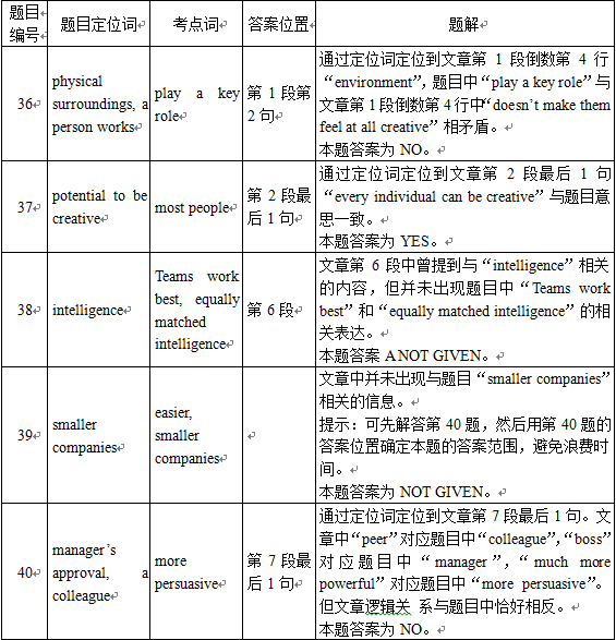 本題型可先看題目,將其中關(guān)鍵詞劃出,回文章查找。如果關(guān)鍵詞只是同義替換,邏輯未變,則答案為YES;如果關(guān)鍵詞中有一個性質(zhì)錯誤或者意義相反,則答案為NO;如果有一個關(guān)鍵詞缺失,則答案為NOT GIVEN。