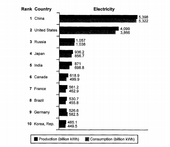 The bar chart below shows the top ten countries for the production and consumption of electricity in 2014. Summarise the information by selecting and reporting the main features, and make comparisons where relevant.