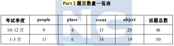 從如上一覽表中不難看出,和 part 1 占比結構比較類似的是在 part2 中人物題和地點題仍然占的是比較小的比例,而事件題與物品題雖然數量上比起上季度有所減少,但仍然占據了總體大部分比例。這也是一直以來的一個普遍規律。每季度題目的具體內容雖然有所調整,但整體上依然換湯不換藥,許多題目使用的素材依舊是類似的,注意我們需要在措辭和回答的重點上具體調整。所以說每個季度的 part 2 題目難度系數趨于穩定,同學們從容應對即可。