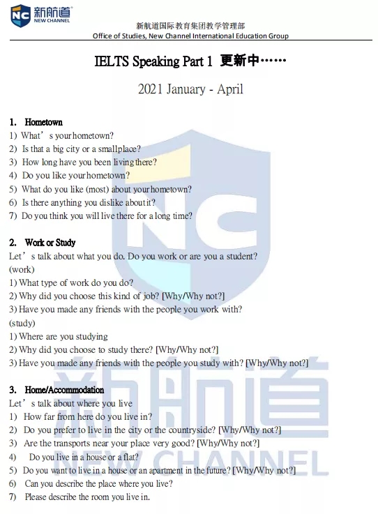 三場開始結束,口語題庫基本穩定,今天趕快跟隨新航道小編來看看2021開年1-4月的最新口語話題庫吧!