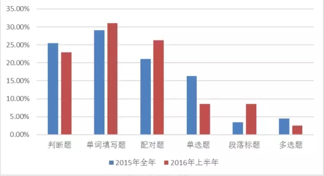 大家從下圖即可看出,與2015年全年相比,2016年上半年單選題下降幅度較大,從去年的16%掉落到今年的9%,題量將近少了一半。于此同時(shí),配對(duì)題則從去年的21%增長(zhǎng)到26%,單詞填寫(xiě)題從29%增長(zhǎng)到31%。所以,大家的備考重點(diǎn)除了要提升針對(duì)細(xì)節(jié)題的把握,在單詞填寫(xiě)題目和判斷題上少失分,同時(shí)從匹配題明顯的增加來(lái)看,還需要多多訓(xùn)練同義替換的識(shí)別能力,特別是針對(duì)如何把題目抽象信息快速在文中的具體信息里識(shí)別的能力。此外,大家也要在心理上做好一篇文章考很多匹配題的準(zhǔn)備,合理分配好時(shí)間,以免在考場(chǎng)上亂了陣腳。