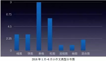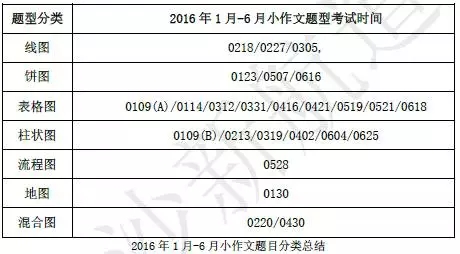 從第一個表格圖可以看出,今年上半年小作文的主流還是數據類。2016年上半年總共25次(1月9日有A、B卷)的寫作考試中,數據類占了23次,而非數據類圖表,比如流程圖和地圖僅分別各占1次。非數據類的考核和2014年的全年13次以及2015年的全年12次相比,目前非數據類在考試中所占的比重有所減少(但不排除在下半年加大考核力度的可能)。