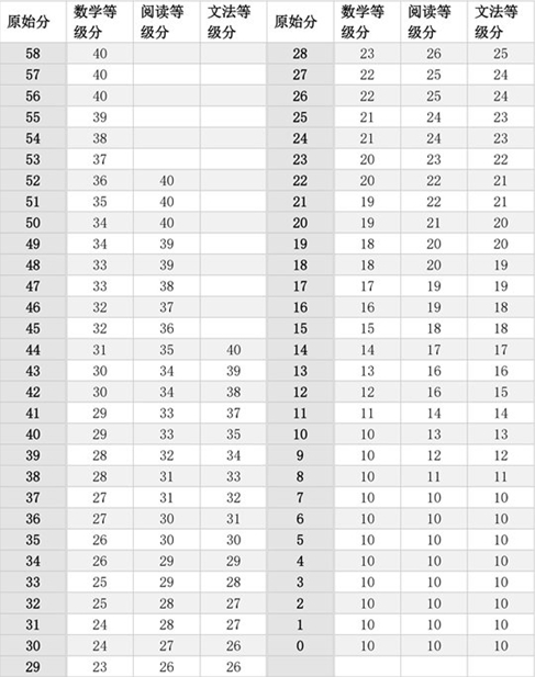 要測(cè)算你的分?jǐn)?shù),首先對(duì)照答案判斷你的回答對(duì)錯(cuò)。然后,計(jì)算你每部分答對(duì)的題目個(gè)數(shù)就得到了原始分(raw score)。使用下表幫助你計(jì)算最終分?jǐn)?shù)。