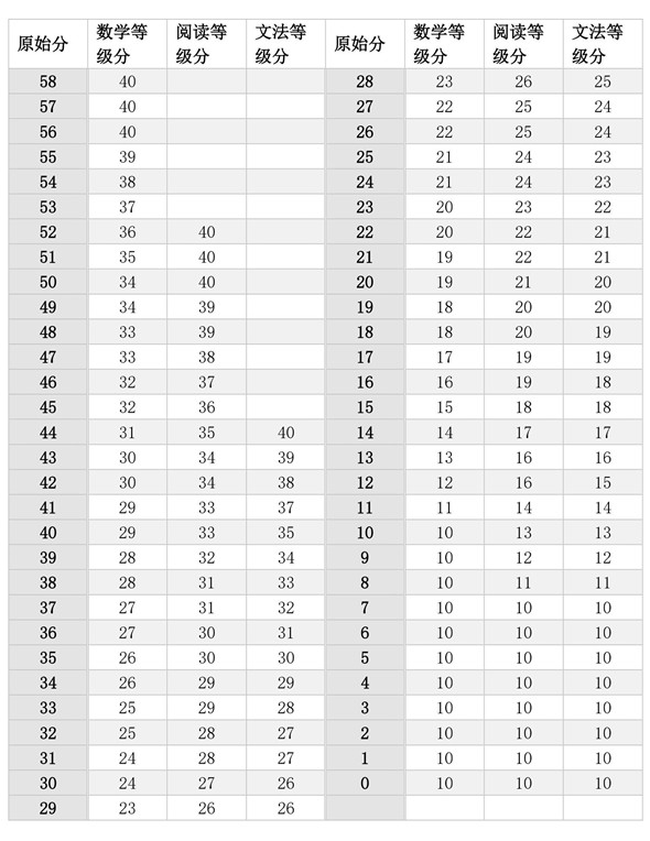 你可以查看各科的800分制分?jǐn)?shù)。方法:把閱讀+文法的等級(jí)分相加,并對(duì)照下表(表一),得出最終分;把數(shù)學(xué)的等級(jí)分,對(duì)照下表(表二),得出最終分。兩個(gè)最終分相加,就得到了1600分制的最終成績(jī)。即:(閱讀+文法的最終分)+(數(shù)學(xué)最終分)=總成績(jī)(400-1600之間)