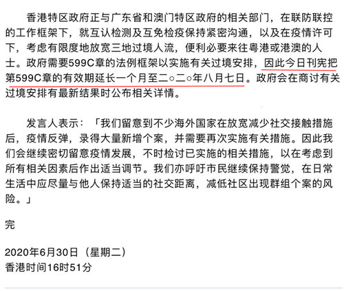 首先是6月30日,香港政府官網(wǎng)更新了大陸入境管制措施,依然把原來的管制措施延期到8月7號(hào)。
