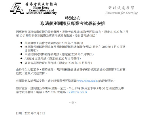 同時(shí),香港考試評(píng)核局7月7日的最新文件,取消了最近的國際及專業(yè)考試,其中有7月的,比如英國倫敦工商會(huì)考試、中國民族民間舞蹈登記考試。