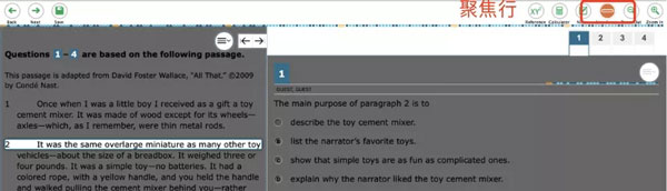 section1界面工具欄,在界面的最上面右邊一排,有數學用的參考公示、計算器,記筆記、聚焦文章某一行文字、放大和縮小界面。line focus對于閱讀還是有幫助的,如果考生比較容易受到其他行的干擾,就可以點擊line focus,逐行閱讀,就像下面這樣: