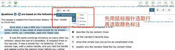 section2閱讀工具,是在閱讀文章的時候可以選用的小工具,也是非常有用的。比如,讀到某些認為是重要的句子,可以用不用的顏色高亮標注,這對于閱讀能力非常不錯的同學來說是個福利,這些同學可能會預測到哪些句子是文章結構的關鍵句子,甚至是會出題的句子;也可以把自己覺得難懂的句子標注一下。箭頭則可以用來隱藏/顯示文章。