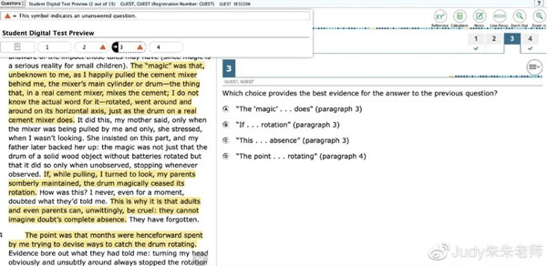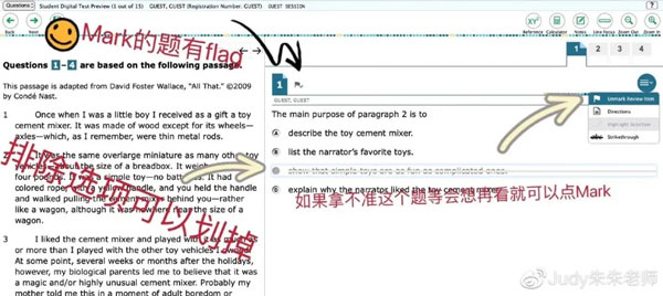 section3是答題小工具。strikethrough是可以劃掉認為是錯誤的選項,正確答案是高亮標注。mark這個工具真的非常人性化了,可以用來標注自己覺得有問題需要再看一下的題目,標記之后再題號的旁邊有標注。