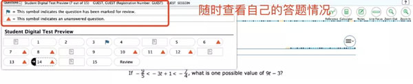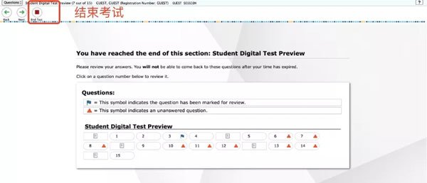 在最后所有部分答題結束的時候,也可以review所有的問題,可以看到哪些題目沒有答,以及哪些題目做了標記。