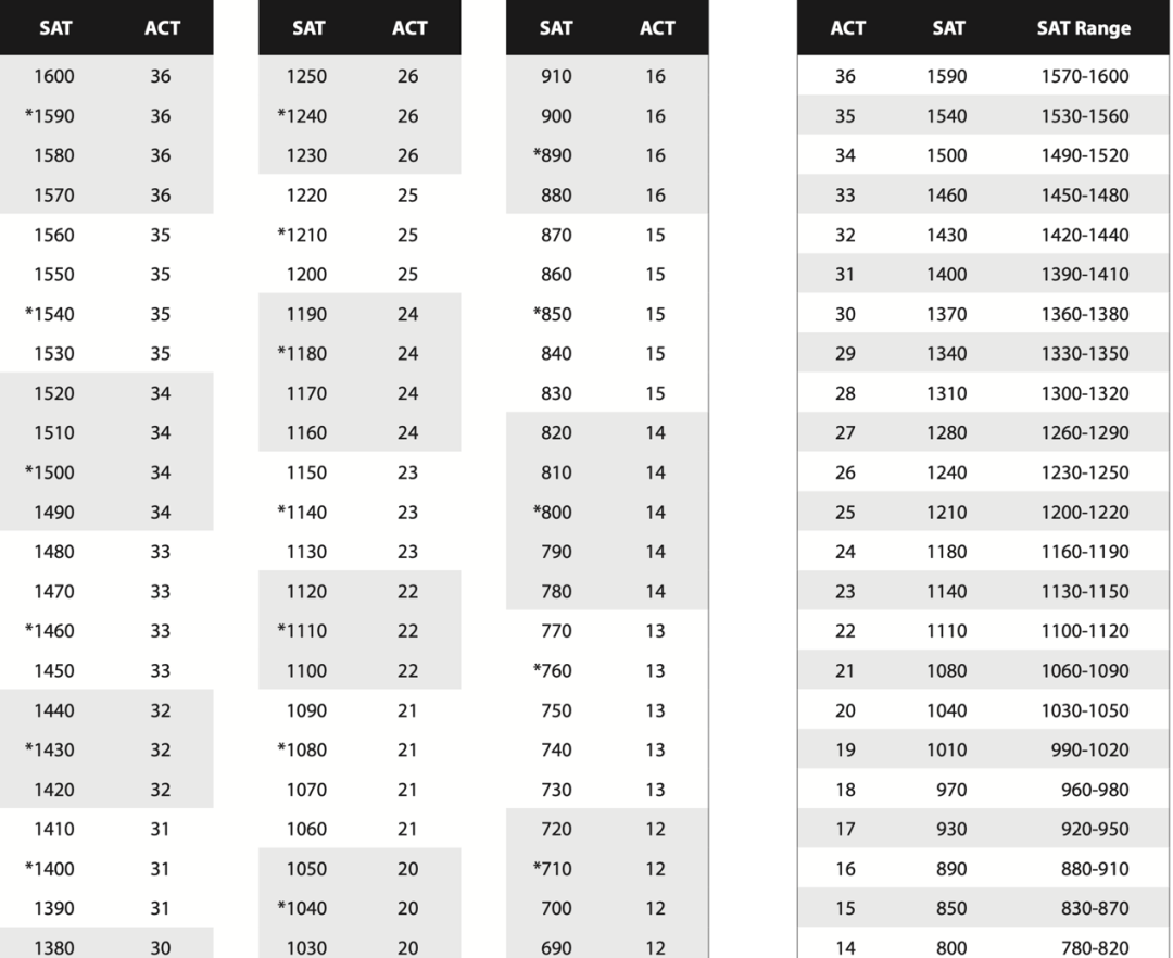 兩個考試的組織方一起進行了兩種考試分數的一致性研究,提供了兩種分數進行對比的表格。我們可以進行大致的對比。