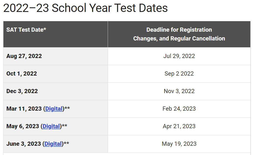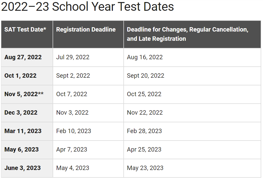 2022/23年SAT考試時間表