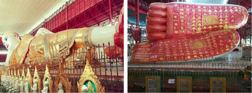 緬甸是宗教信仰很濃郁的國度,到了緬甸寺院也是必到之處,達基臥佛寺因寺內立有一尊6層樓高的巨大臥佛而著名,這尊臥佛原本是尊露天的的大坐佛,1953年建成,后使用大量緬甸玉將其改造成大臥佛。長20米,高5.4米,臥佛四周沒有墻壁,佛的兩只腳一前一后,腳底有108個圖案,代表著108次輪回,以手為枕頭,雙眼注視著盤跪在地的虔誠信徒,據說這種姿勢是佛在休息,而非涅磐。
