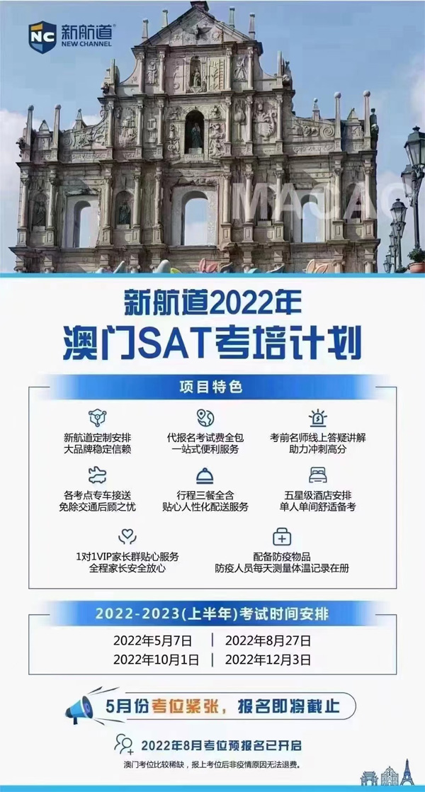 摘要:新航道2022年8月27日澳門SAT考試團 報名中....參考時間安排:2022年8月: 8月25號出發, 8月28號返程,1. 新航道定制安排,大品牌穩定信賴; 2. 代報名考試費全包,一站式便利服務