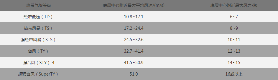 各類熱帶氣旋所對應(yīng)的風(fēng)力等級如下: