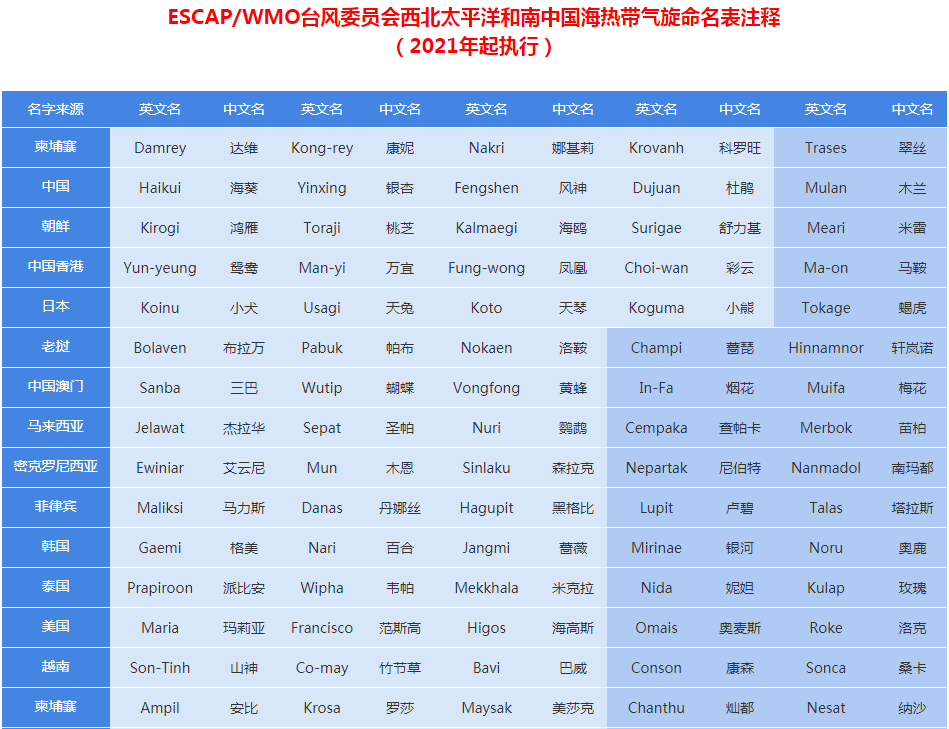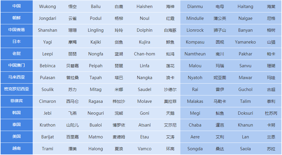 這些名字由世界氣象組織亞太地區(qū)的14個成員國和地區(qū)提供,一共有140個,WMO將這140個名字制作成表格,按順序年復(fù)一年地循環(huán)重復(fù)使用。