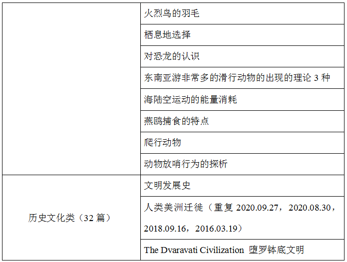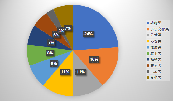 接下來筆者對以上214篇文章進行了常規分類話題統計:其中,動物類依然高居榜首,共51篇,接著是歷史文化類32篇、藝術類24篇、經貿類24篇、地質類18篇、農業類16篇、植物類15篇、天文類13篇,氣象類6篇、其他類(心理學、教育學、生理學、生命科學)15篇。