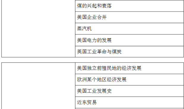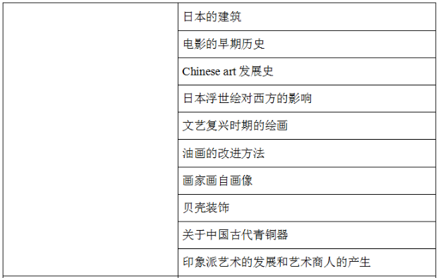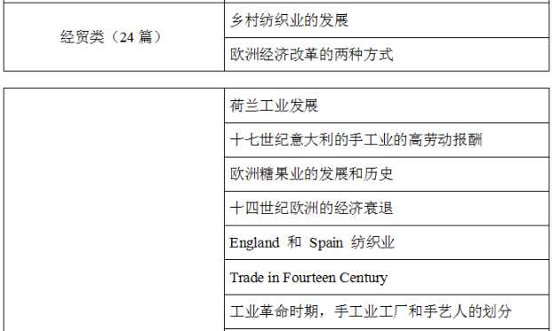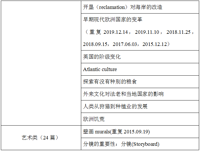 藝術類經常探討壁畫、電影、建筑、藝術流派。經貿類主要圍繞工業革命、某個地區經濟發展或衰退原因、對外貿易等。