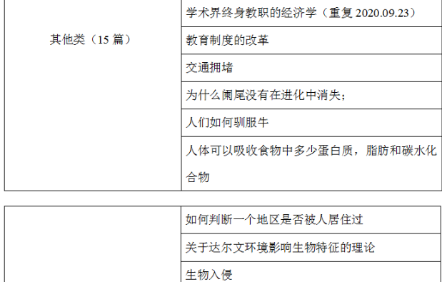 其他類涉及到了人類生理、美國教育制度和生命的起源。具體話題占比和所含篇目如下: