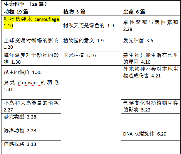 生命科學(xué)類型篇章以動(dòng)物學(xué)為主要考察方向,涉及動(dòng)物行為(動(dòng)物偽裝、信鴿找路、動(dòng)物的記憶、熊貓吃竹子、海洋生物產(chǎn)卵、珊瑚保護(hù)色、棱皮龜、螞蟻的學(xué)習(xí)能力),體征(昆蟲(chóng)的觸角、翼龍的羽毛、恐龍類型、海洋動(dòng)物)及對(duì)動(dòng)物進(jìn)行的實(shí)驗(yàn)等,尤其是動(dòng)物找路這種老梗,依然頻繁出現(xiàn)。