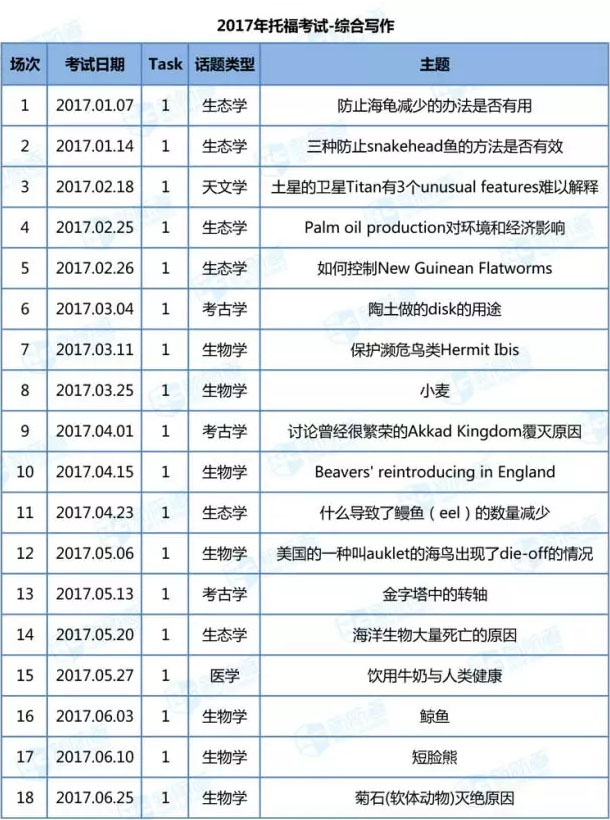 2017年上半年的綜合寫作還是以生物類、考古類和生態類題目為主,去年前三甲也是這三個類別。其中生物學7次,考古學3次,生態學6次。相對而言,生物學的霸主地位不可撼動,根據去年的43場考試中,有17場的總量是考查生物學來看,下半年該話題仍然會出現10道左右,所以建議考生在備考時,多利用TPO模考軟件中考生物學的相關套題來熟悉相關學術詞匯和出題套路。作為去年排名第二的考古學,今年下半年露臉的次數應該也不會很少,尤其是在上半年被生態學壓制3題情況下。
