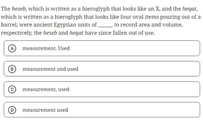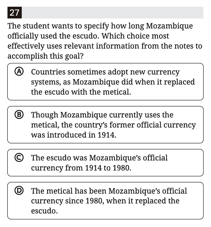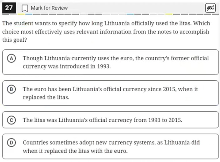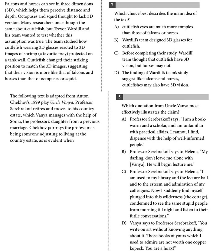 01 閱讀部分 詩歌是關于一個人來到鄉下,說自己forgettable about things in his work+ recall childhood,問recall的意思,答案應該是remember; 邏輯類題目考查的是單細胞生物進化和細菌之間的關系,在四個選項中找一個支持文中假說的證據。 圖表題考了一個主題為lizards might not use maximum speed even when escaping from predation ,圖表的y軸是number of species,x軸speed 然後給了一個圖表上面有y 軸number of species跟x軸 speed % 雙篇關系題考的是text 1 韓國的一個城市被稱為美食之都,有人認為這是一個很好的提升旅游業的機會。text 2 認為光被評為美食之都還不夠,還需要其它的努力。題目問text2 如何回應 text 1,答案是評為該稱號并不會自動使該地的旅游業變好。該題經常考,每次考的城市名字都不一樣,但是內容和邏輯不變。 圖表題均比較簡單,有直接的查找數據的題目,也有用數據支持假說的題目。 根據我們過往的經驗,SAT機考形式: