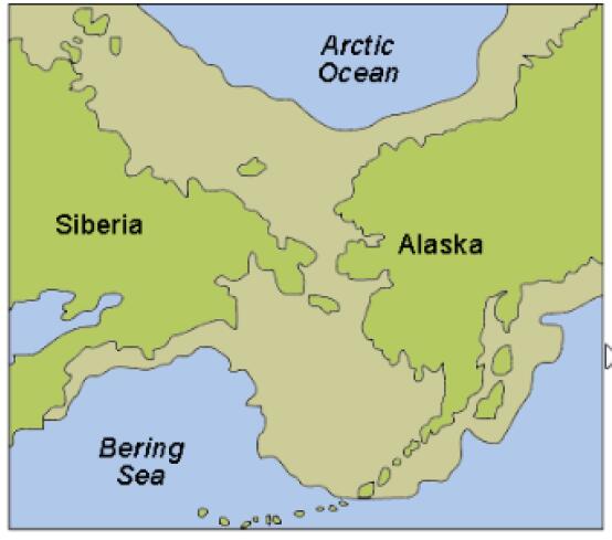 During the peak of the last ice age, northeast Asia (Siberia) and Alaska were connected by a broad land mass called the Bering Land Bridge. This land bridge existed because so much of Earth’s water was frozen in the great ice sheets that sea levels were over 100 meters lower than they are today. Between 25,000 and 10,000 years ago, Siberia, the Bering Land Bndge, and Alaska shared many environmental characteristics. These included a common mammalian fauna of large mammals, a common flora composed of broad grasslands as well as wind-swept dunes and tundra, and a common climate with cold, dry winters and somewhat wanner summers. The recognition that many aspects of the modem flora and fauna were present on both sides of the Bering Sea as remnants of the ice-age landscape led to this region being named Beringia.