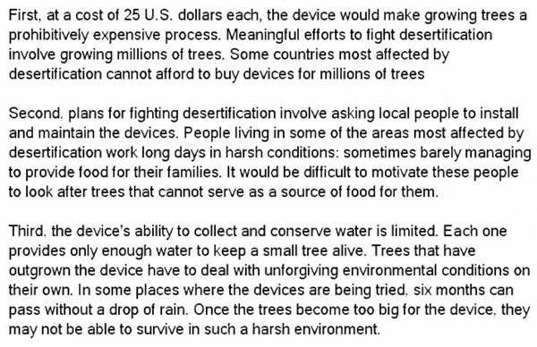 Because of climate change,more and more land that was once used to grow crops or provide food for animals is turning to dry,unusable desert land.There are many proposals about how to stop this process,known as desertification.A number of proposals invole growing trees,because trees can help protect soil and provide many other benefits to fight against desertification.Some scientists have proposed that the best way to grow trees in dry areas in danger of desertification is by using a box-shaped device surrounding the young tree.The device collects water that condenses from vapor in the atmosphere and helps the tree to grow.However,other scientists believe that this device will not be successful in fighting against desertification for the following reasons.